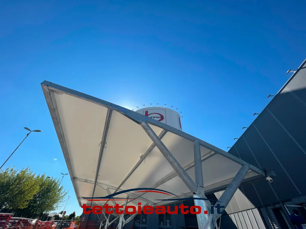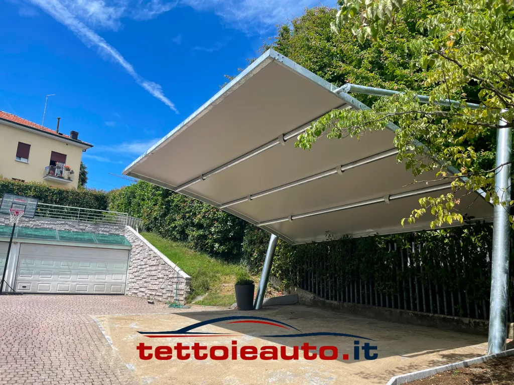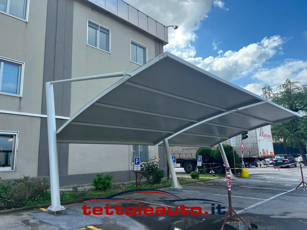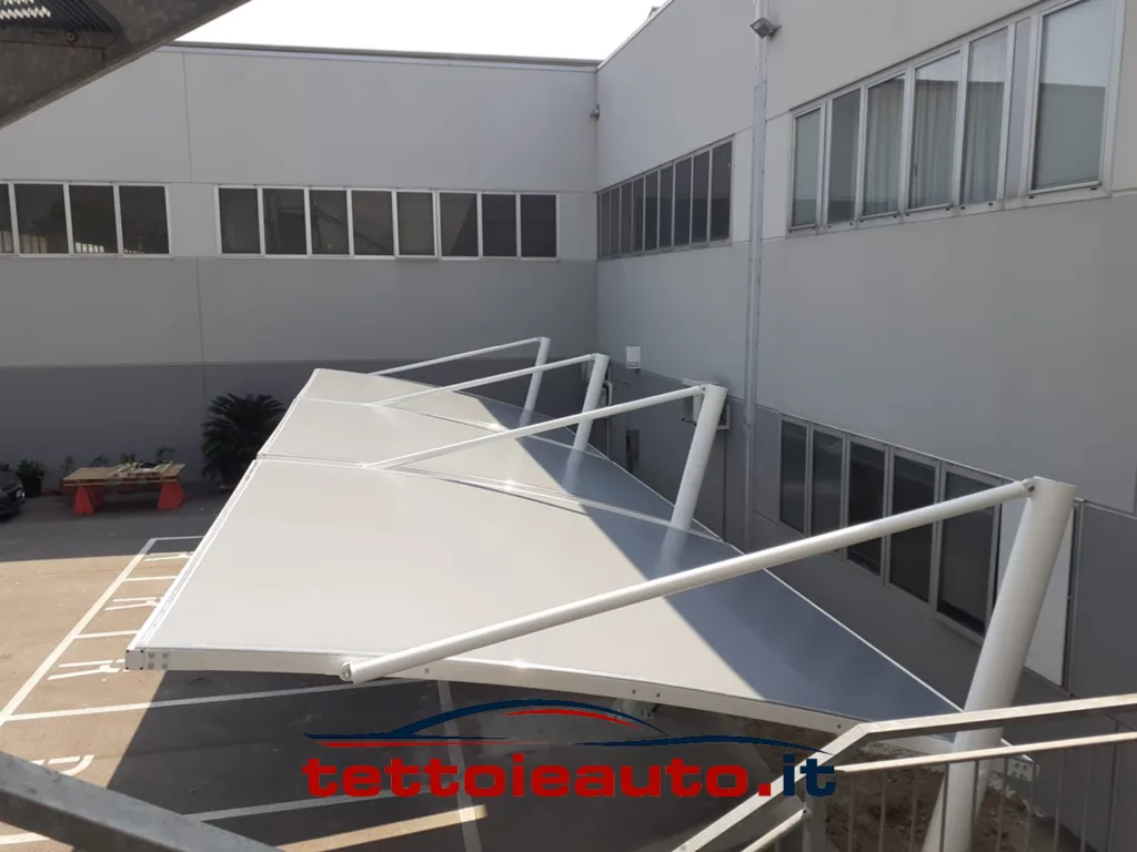 Il tensionamento avviene tramite profilati in alluminio che conferiscono alla copertura per auto un perfetto impatto visivo senza pieghe e un fissaggio che ne preserva la durata nel tempo.