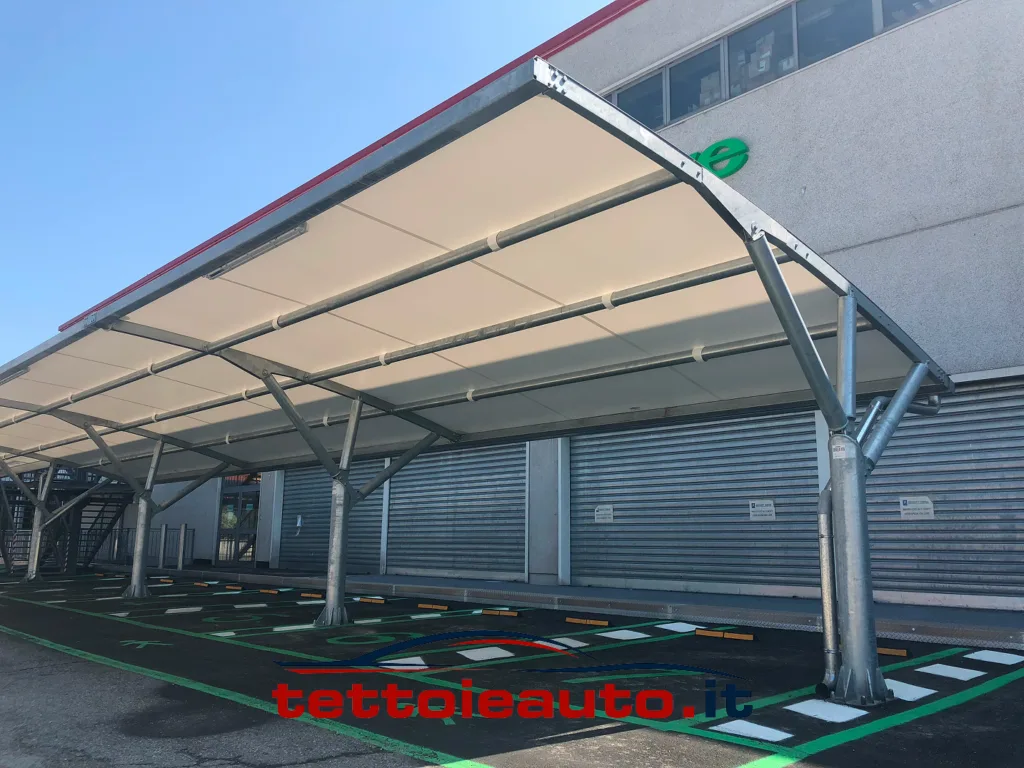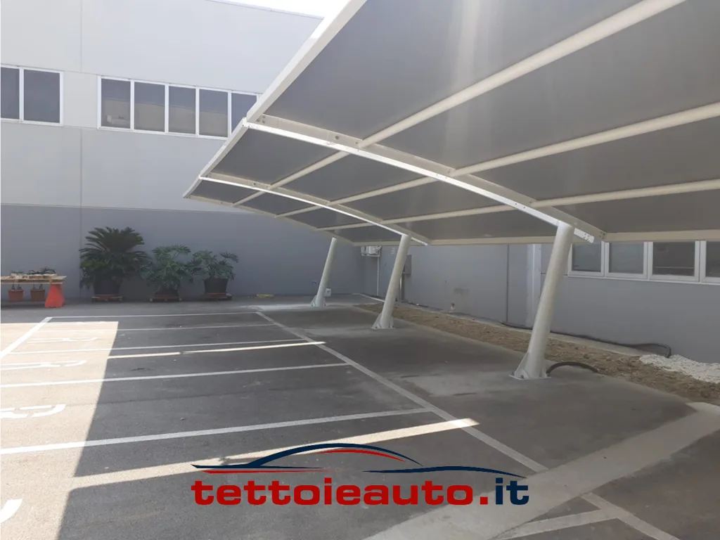 La struttura delle pensiline auto è costituita da carpenteria metallica e manto di copertura in membrana di poliestere spalmata di PVC. Sulla membrana sono state eseguite le verifiche di resistenza in accordo con quanto riportato dal progetto di norma UNI U50.00.299.0.
