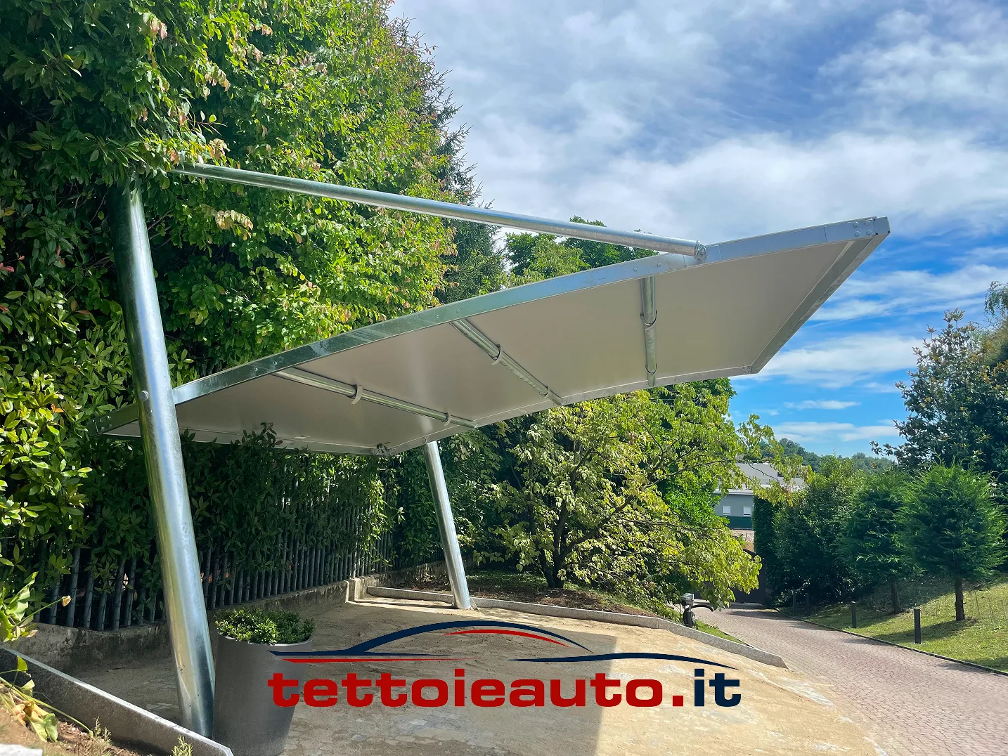 Il tensionamento avviene tramite profilati in alluminio che conferiscono alla copertura per auto un perfetto impatto visivo senza pieghe e un fissaggio che ne preserva la durata nel tempo.