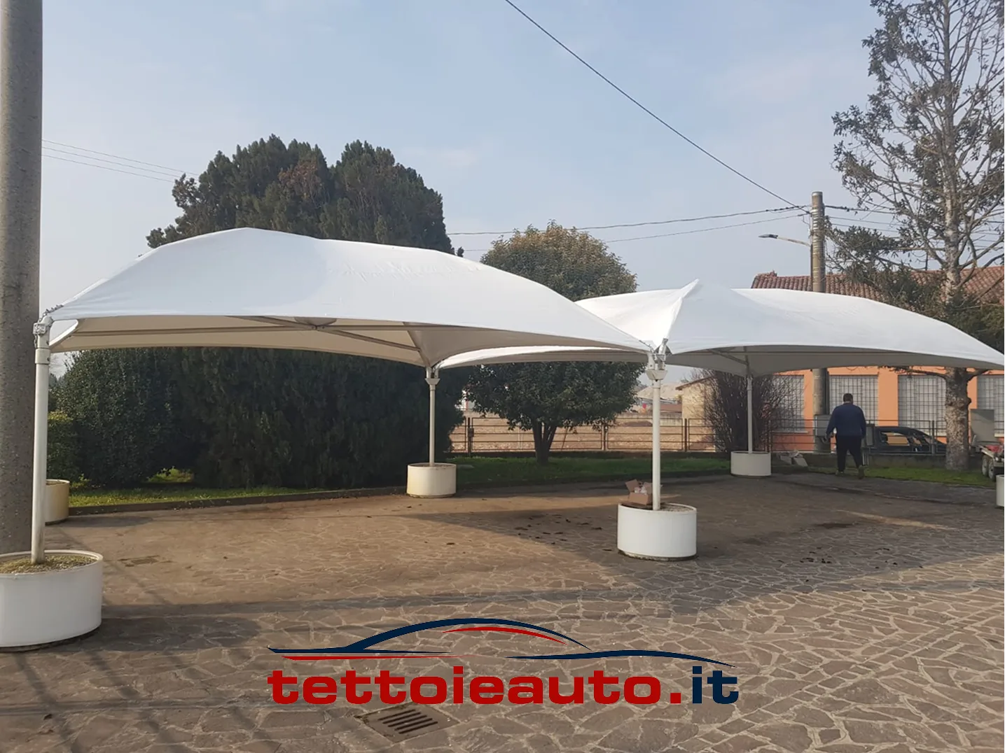 Il nostro gazebo per auto Cicogna MAX pesante è progettato per coprire piazzali esterni di ampia metratura ed è ideale per: