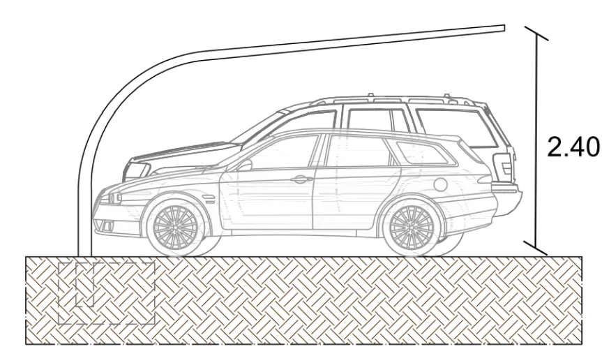 Il sistema di fissaggio al suolo della tettoia antigrandine MX10 prevede il realizzo di plinti interrati che garantiscono la giusta tenuta strutturale, in presenza di una pavimentazione in cemento armato la tettoia auto potrebbe essere fissata anche direttamente con piastra base.