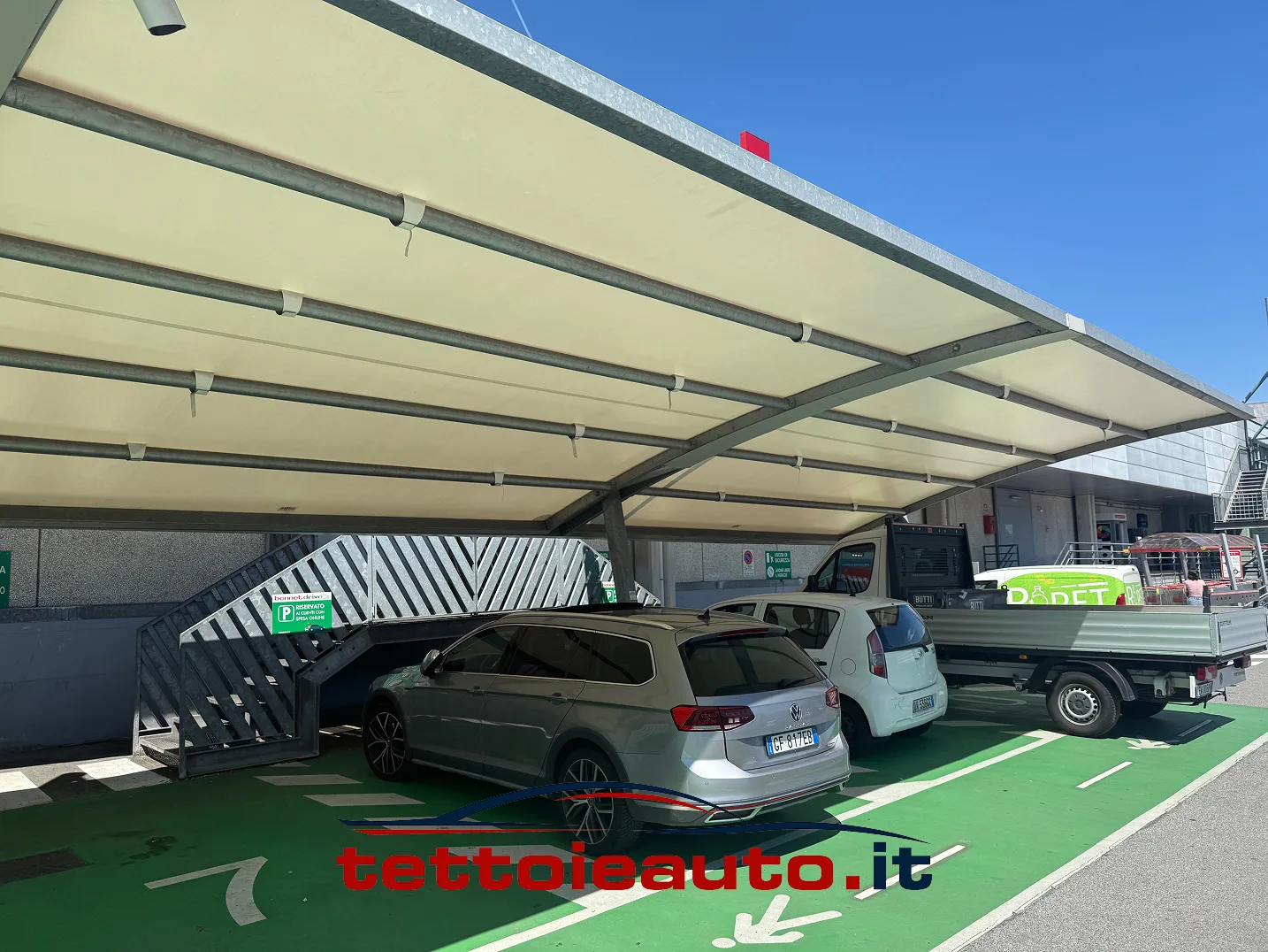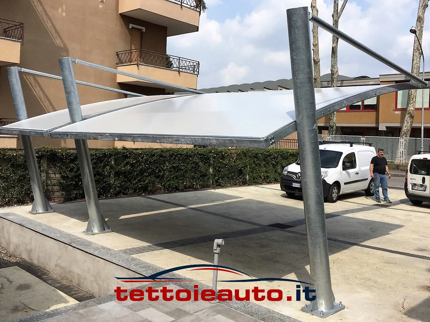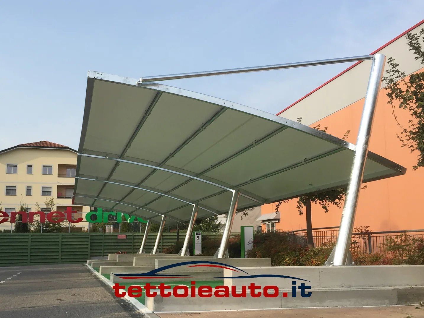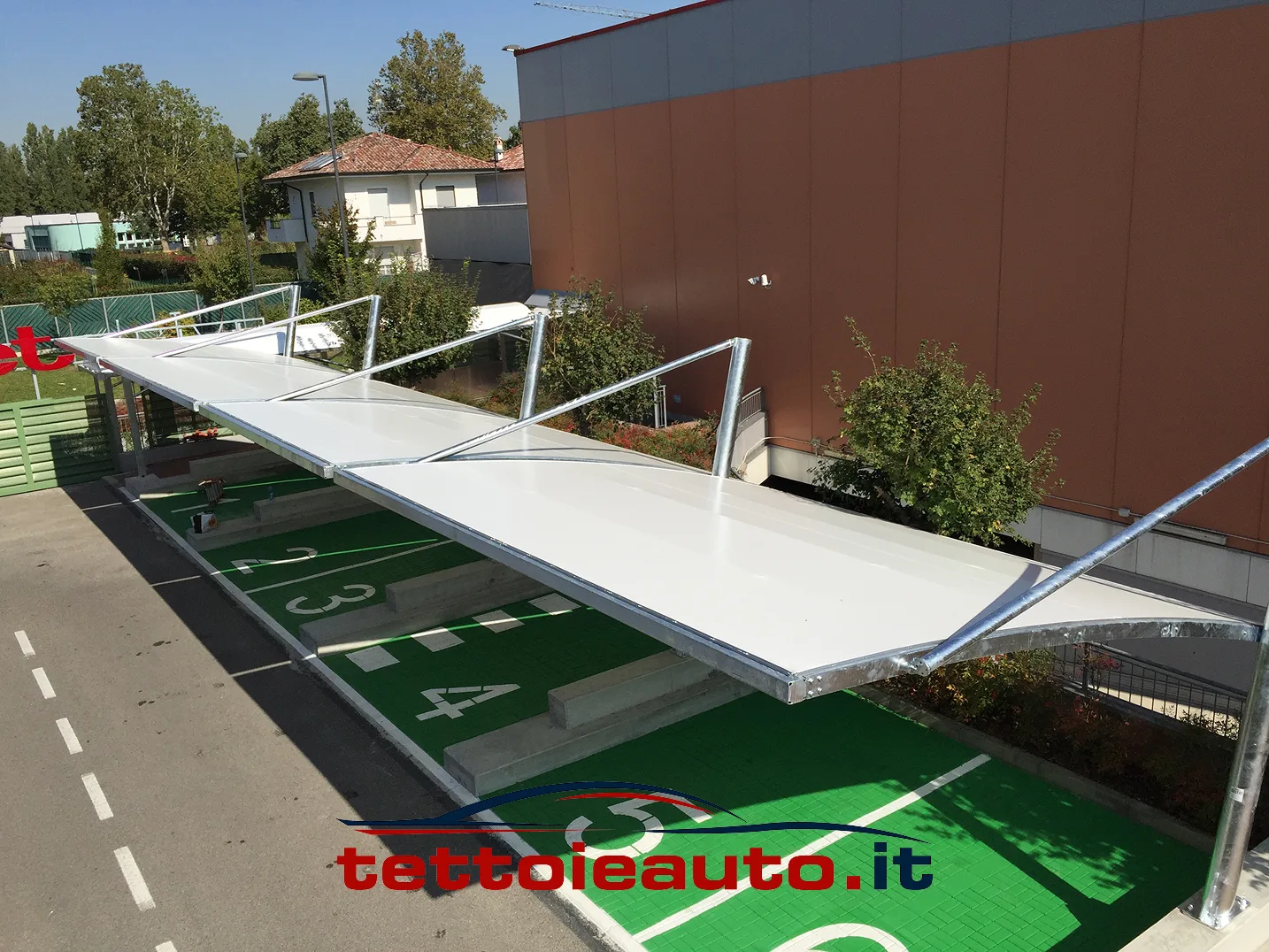 La struttura delle pensiline auto è costituita da carpenteria metallica e manto di copertura in membrana di poliestere spalmata di PVC. Sulla membrana sono state eseguite le verifiche di resistenza in accordo con quanto riportato dal progetto di norma UNI U50.00.299.0.