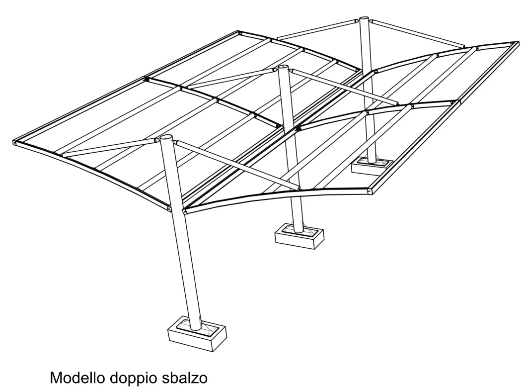 Nel caso ci fosse la necessità di coprire due file di parcheggi per auto è possibile scegliere la versione tettoie per auto modulari MX20 a doppio sbalzo o bifrontale.