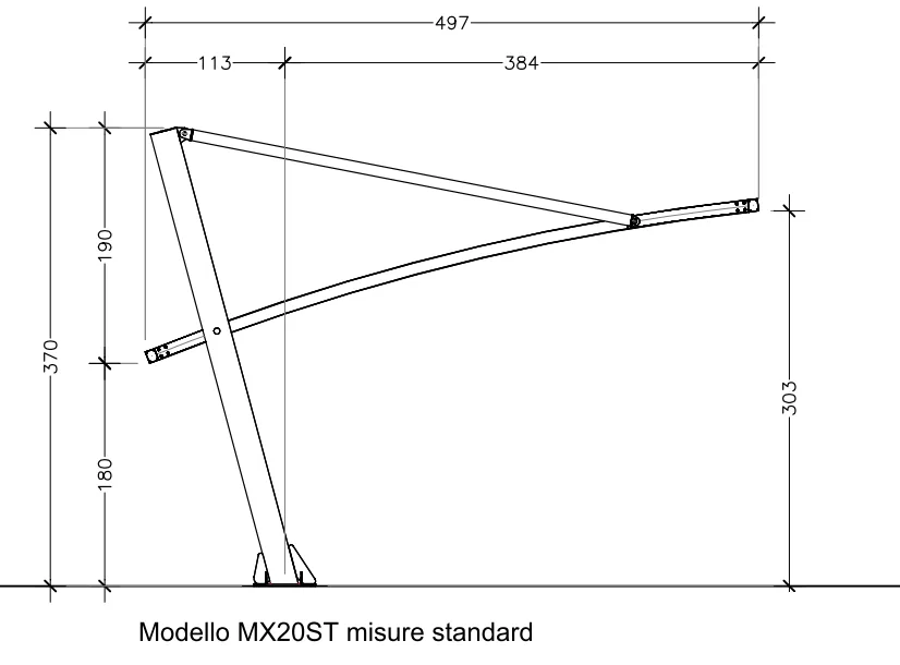 Gli schemi e le quote indicate individuano i nostri standard di produzione. Tutte le tettoie per auto MX20ST riportate possono essere modificate nelle dimensioni di larghezza e altezza per progetti personalizzati e su misura.